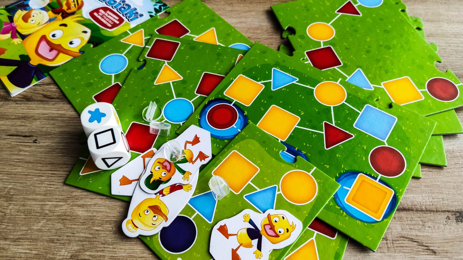 Sympatyczna gra polegająca na tym, żeby doprowadzić kaczuszki do mamy kaczki. Żeby to zrobić trzeba znać kolory i kształty, bo właśnie w oparciu o nie wykonuje się ruchy na planszy. Każdy gracz wybiera też korzystniejszą dla siebie drogę, gdy znajdzie się na rozdrożu. Oczywiście wygrywa gracz, który pierwszy dotrze do celu. Dobrym pomysłem jest to, że na końcu mama kaczka też zmienia swoje miejsce, dzięki temu wcale nie tak łatwo do niej dotrzeć. Plansza jest składana z kilku elementów w formie puzzli, jest długa, więc droga do kaczki chwilę zajmuje :) Bardzo podoba mi się wykorzystanie w grze kolorów i kształtów, dzieciaki mogą dzięki temu szybko opanować i ćwiczyć nowe umiejętności :)